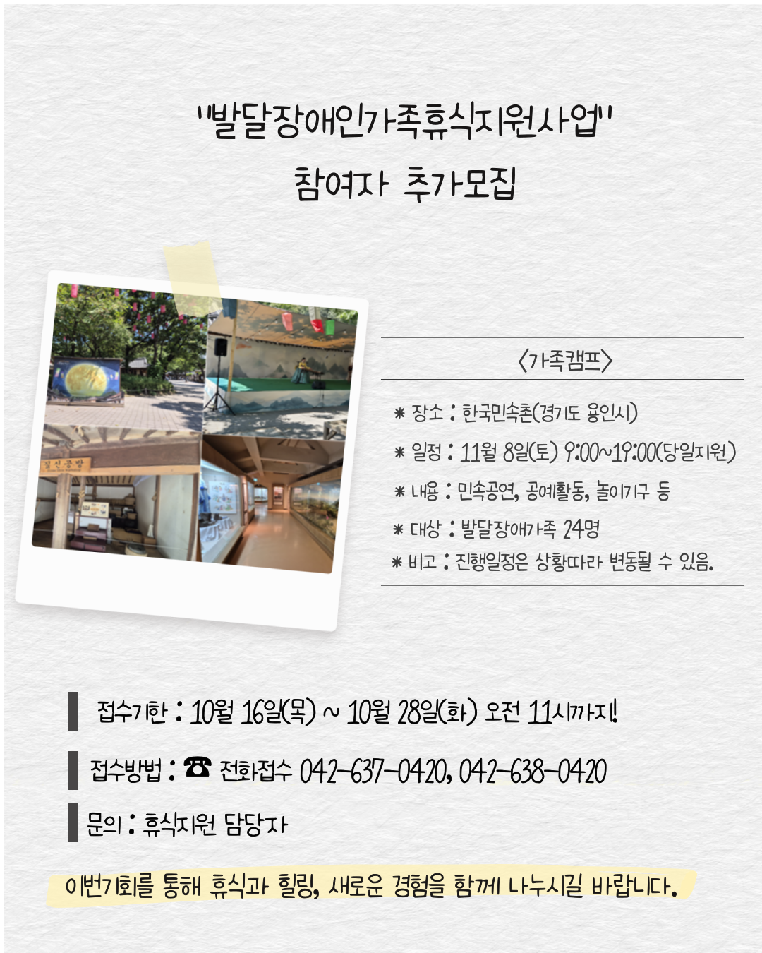 안녕하세요:) 발달장애가정의 "휴식지원"을 위해 "추가로 참여가정을 모시고자 합니다.관심이 있으신 가정분들은 아래 포스터를 확인하여 주시길 바라며, 이번기회를 통해 휴식과 힐링, 새로운 경험을 함께 나누는 기회가 되었으면 좋겠습니다.