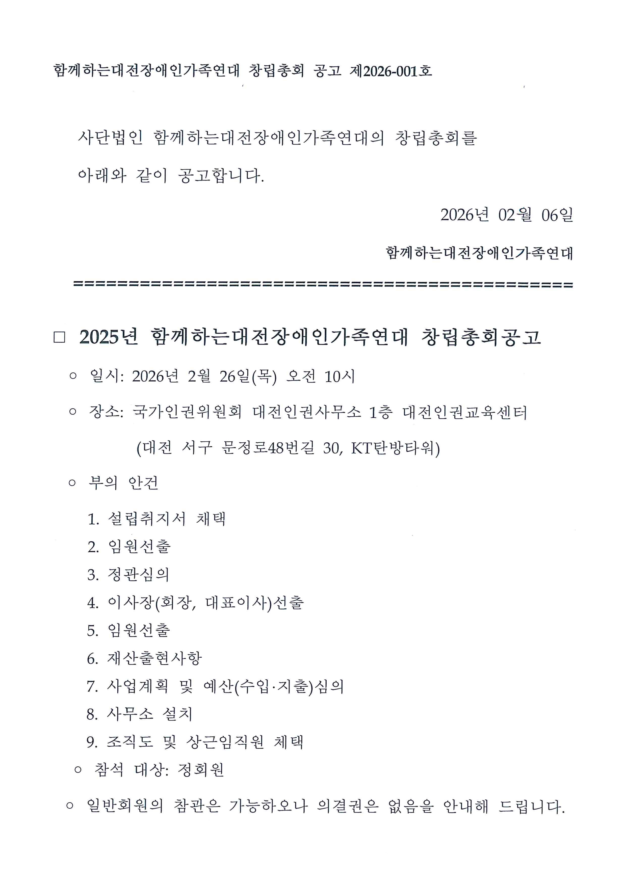 함께하는대전장애인가족연대 창립총회 공고