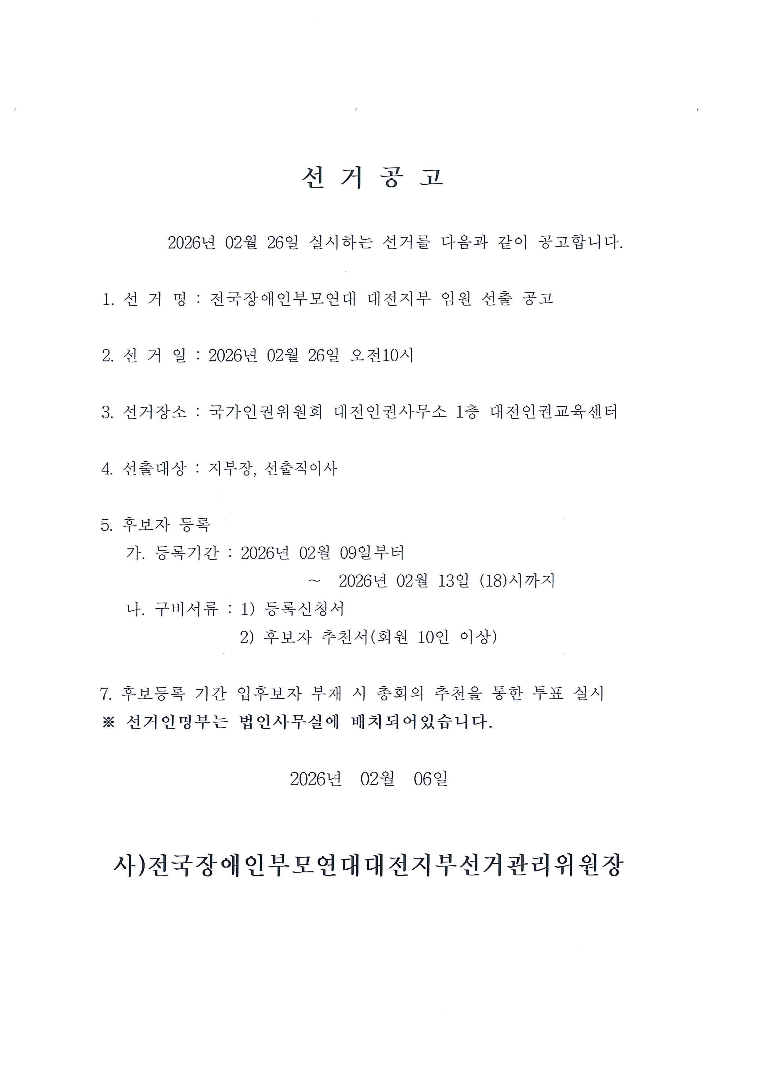 선거공고 - 전국장애인부모연대 대전지부 임원선출